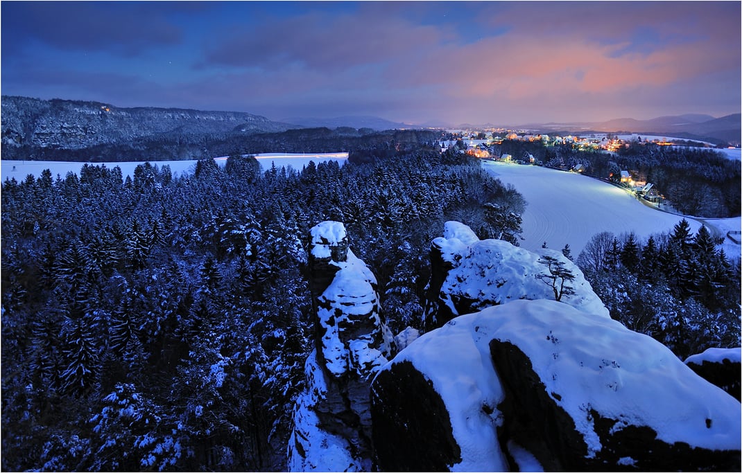 Ein Bild das noch lange in Erinnerung bleibt. Der Halbmond bringt ordentlich Licht auf die verzuckerte Landschaft, am Himmel blitzen ein paar Sterne durch die Wolken. Waltersdorf liegt wie ein verzaubertes Weihnachtsdorf im Tal, links über dem Polenztal leuchtet die Brandbaude. Eine Stimmung wie man sie sich nicht schöner hätte ausmalen können. Die Sächsische Zeitung prämierte dieses Foto beim Winterfotowettbewerb im Februar 2017 mit dem ersten Platz womit auch bei mir diese wunderschöne Winternacht nochmal zum Leben erweckt wurde.