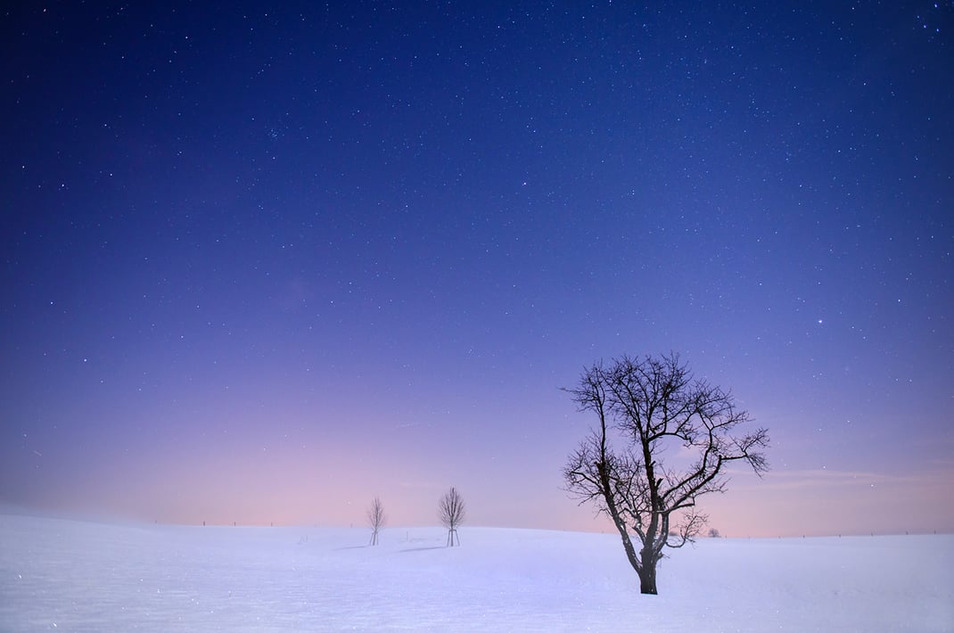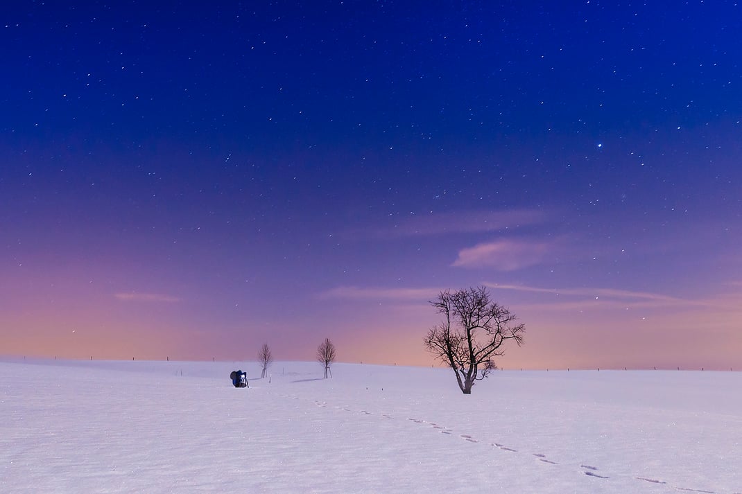 Oben angekommen liegt die "Blaue Stunde" in ihren letzten Zügen, schnell wird es dunkel. Zügig wird die Kamera auf das Stativ geschraubt und alle Einstellungen für die Nachtfotografie werden manuell festgelegt. Vom Himmel leuchtet der Halbmond auf die verschneite Landschaft, der weiße Schnee reflektiert das Licht so stark dass selbst bei völliger Dunkelheit keine sehr hohen ISO-Werte nötig und bereits Belichtungszeiten unter 10 Sekunden ausreichend sind. Ich genieße diese unglaublich schöne Stille auf dem Berg, fotografiere und halte immer wieder inne. Dass mir an diesem Abend auch eins meiner absoluten Lieblings-Winterbilder gelingt, das zu einem späteren Zeitpunkt sogar mal einen Wettbewerb gewinnen soll interessiert mich momentan herzlich wenig. Es geht wie so oft einfach nur darum den Moment zu genießen. Und dies kann ich an diesem Abend in vollen Zügen, über zwei Stunden lang stehe ich alleine auf dem Berg. Zum Schluss sehe ich mir einfach nur den schönen Sternenhimmel an...