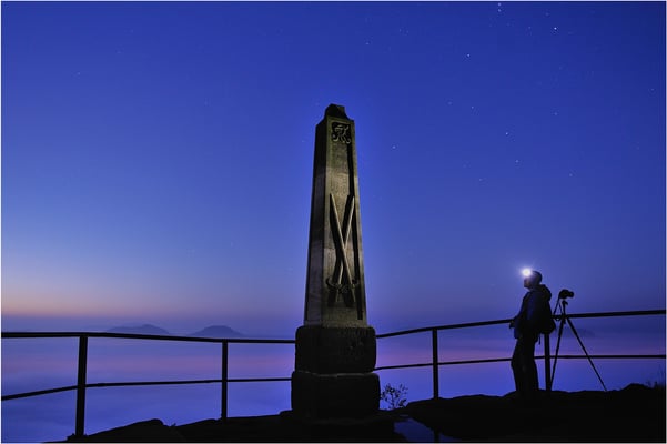 Lichtspielereien mit der Stirnlampe auf dem Lilienstein. In den Sommermonaten muss der Aufstieg schon sehr zeitig bewältigt werden, will man oben auf dem Gipfel "noch was mit Sternen machen" bevor die Dämmerung eintritt. Dann heißt es mitunter schon gegen 2 Uhr zu Hause die gemütlichen Federn zu verlassen...