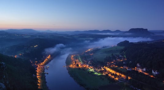 Blaue Stunde über dem Elbtal. Unten liegt der Kurort Rathen an einem Sonntagmorgen noch im Tiefschlaf...